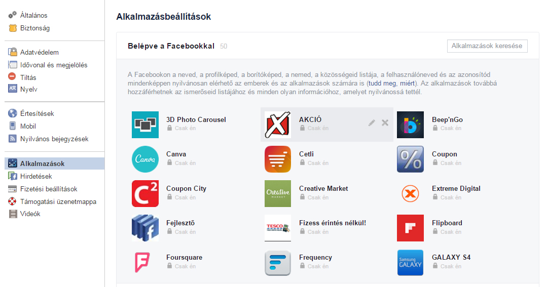 4. Sokan nem is hinnék, hogy pár év facebookozás után mennyi alkalmazásnak adtak már engedélyt, hogy hozzáférjen a személyes adatokhoz. Ezt a listát néha nem árt átnézni, és azoknál az alkalmazásoknál, amelyeket nem használunk, törölni a hozzáférést, vagy legalább korlátozni.